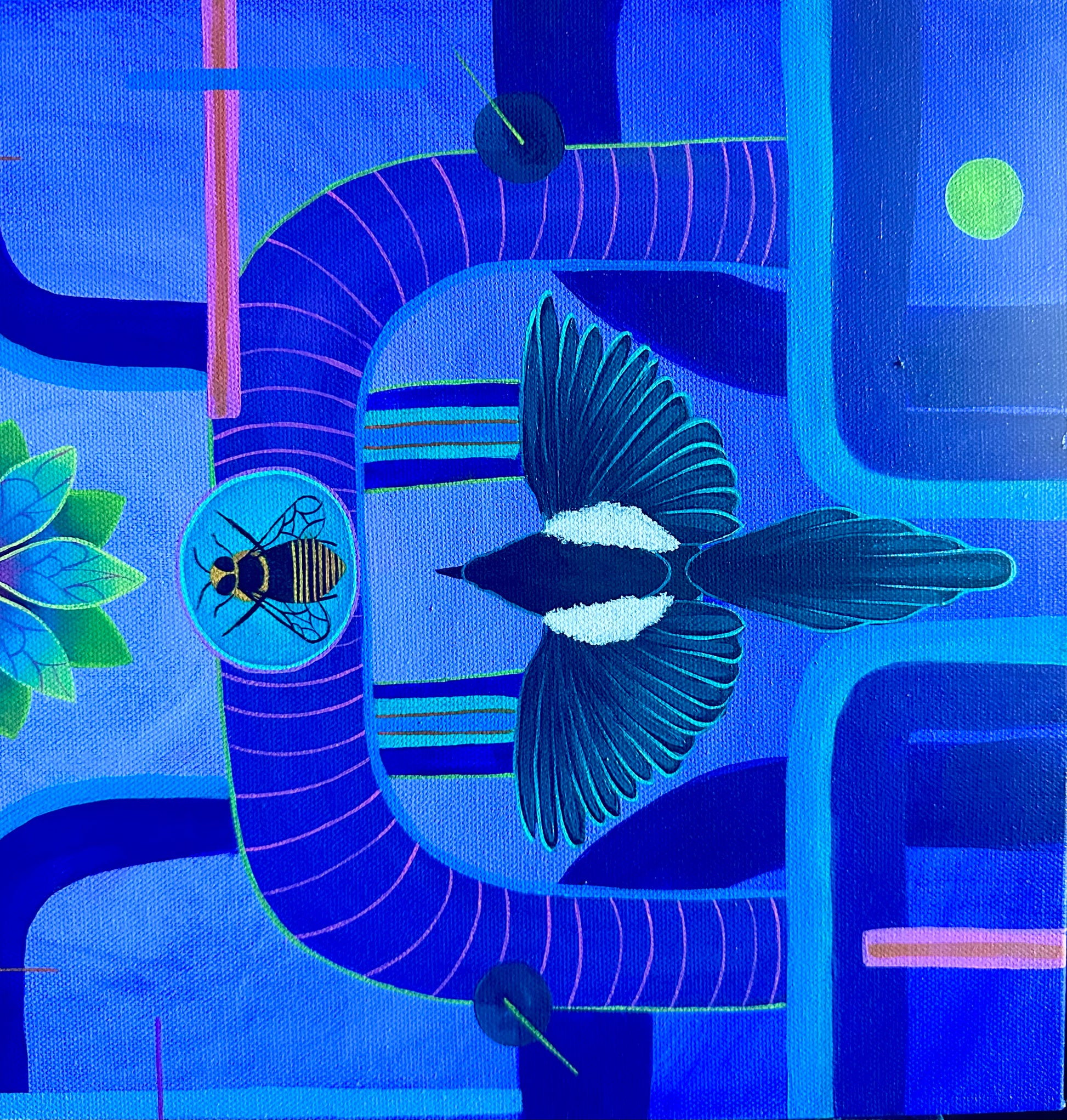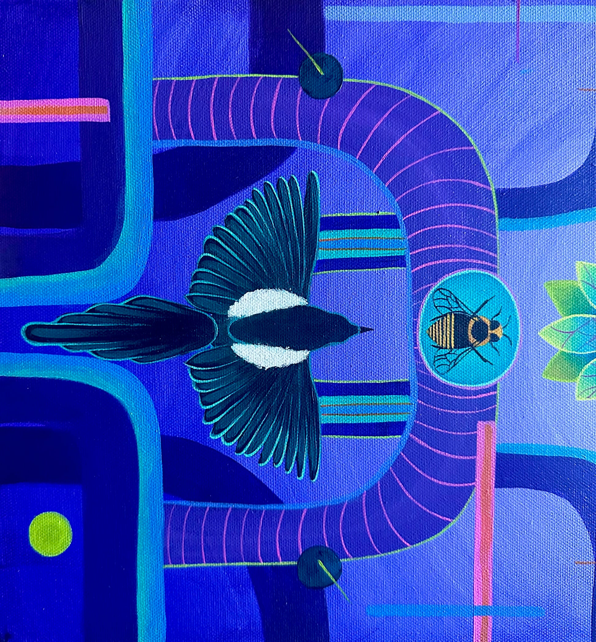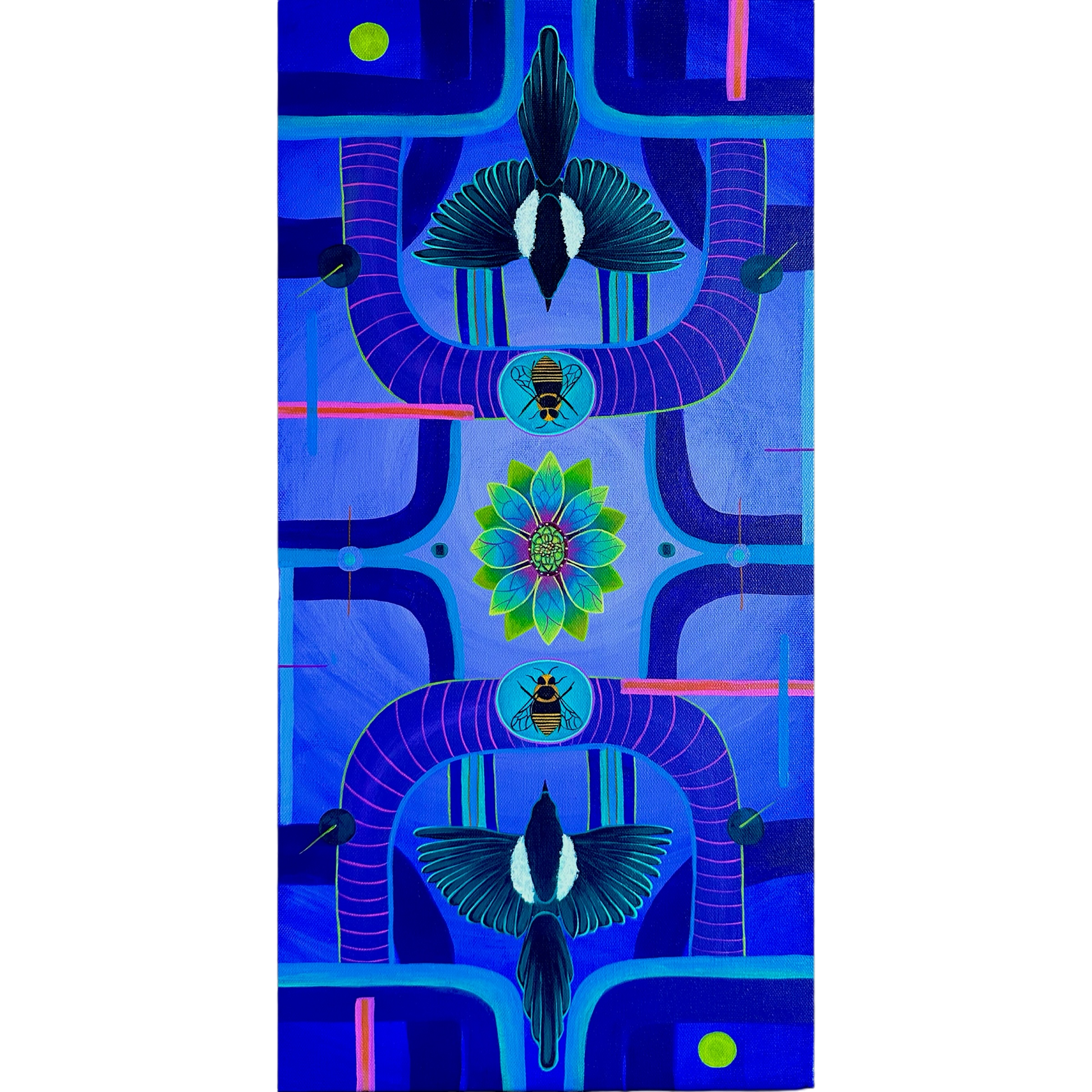 "The Birds & The Bees" is a vivid exploration of nature's intricate beauty, depicted through bold geometric patterns and a striking color palette dominated by deep blues and purples. At the center of the composition, two symmetrical birds spread their wings in perfect harmony, symbolizing balance and freedom. Below them, vibrant flowers burst forth with life, surrounded by the delicate yet purposeful presence of bees, which represent the cycle of life and the interconnectedness of all living things.
